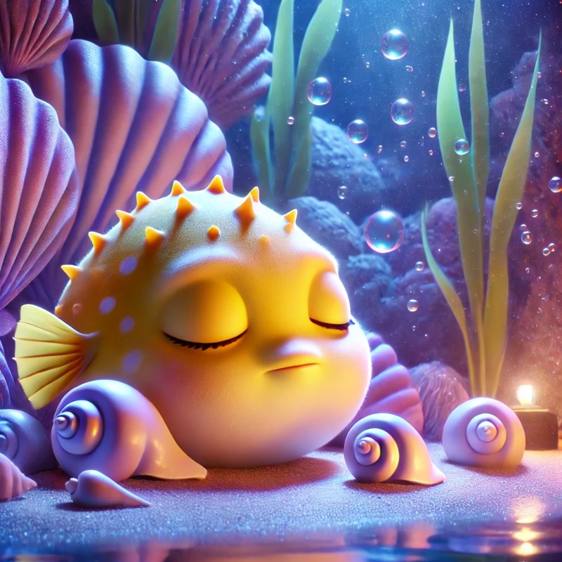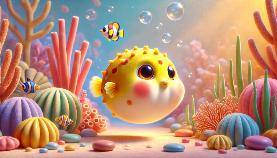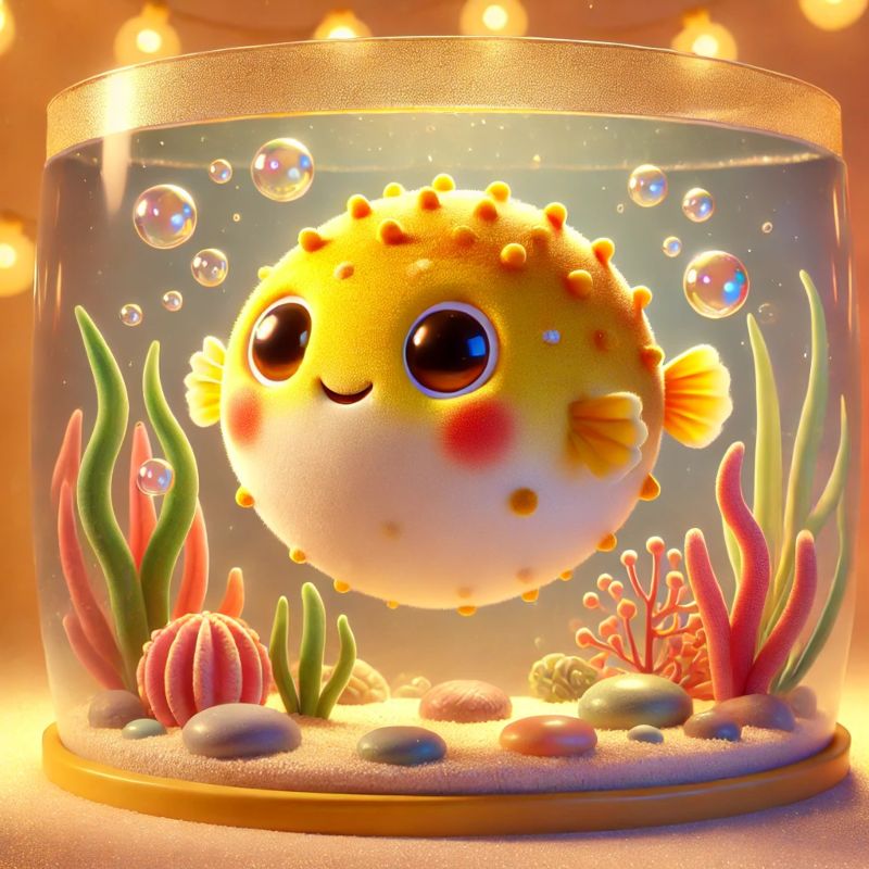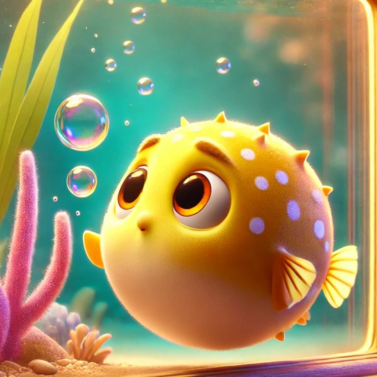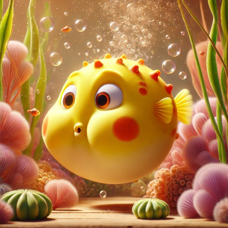 IN A QUIET CORNER OF A COLORFUL FISH TANK LIVES BOLLA. HE IS A LITTLE YELLOW PUFFERFISH WITH ORANGE SPOTS.