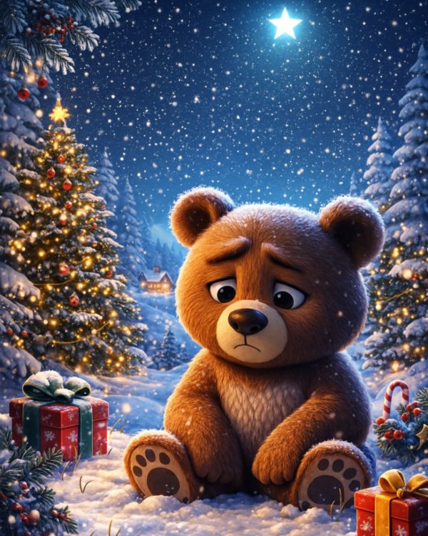 “Che fa un orso solo a Natale?” pensa. “Boh. Mangia miele e conta i fiocchi di neve.”